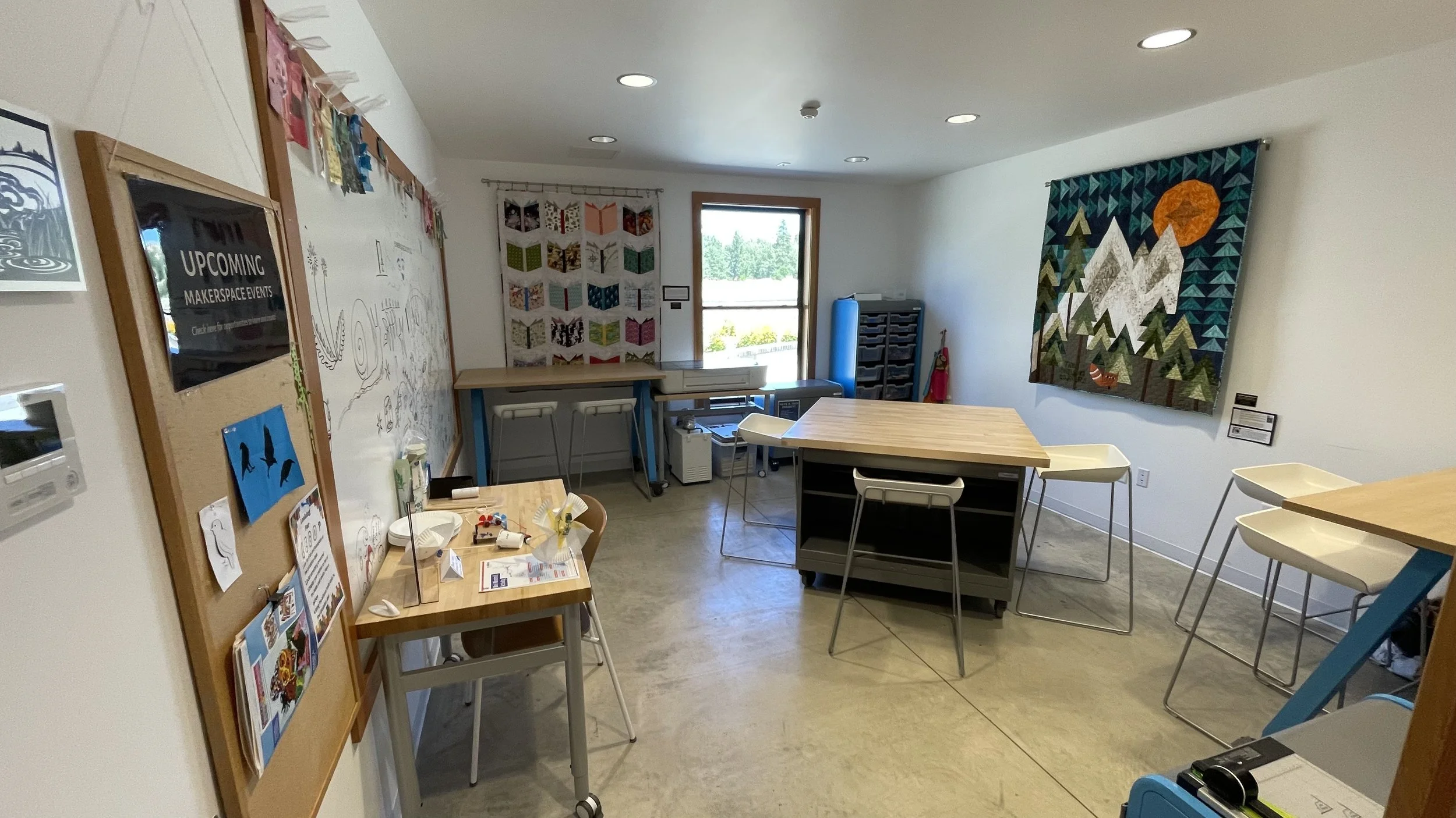 Drop by the Makerspace any time to explore and create! Enjoy free access to the Glowforge laser cutter, sewing machines, craft supplies, soldering iron, and other various STEM equipment.